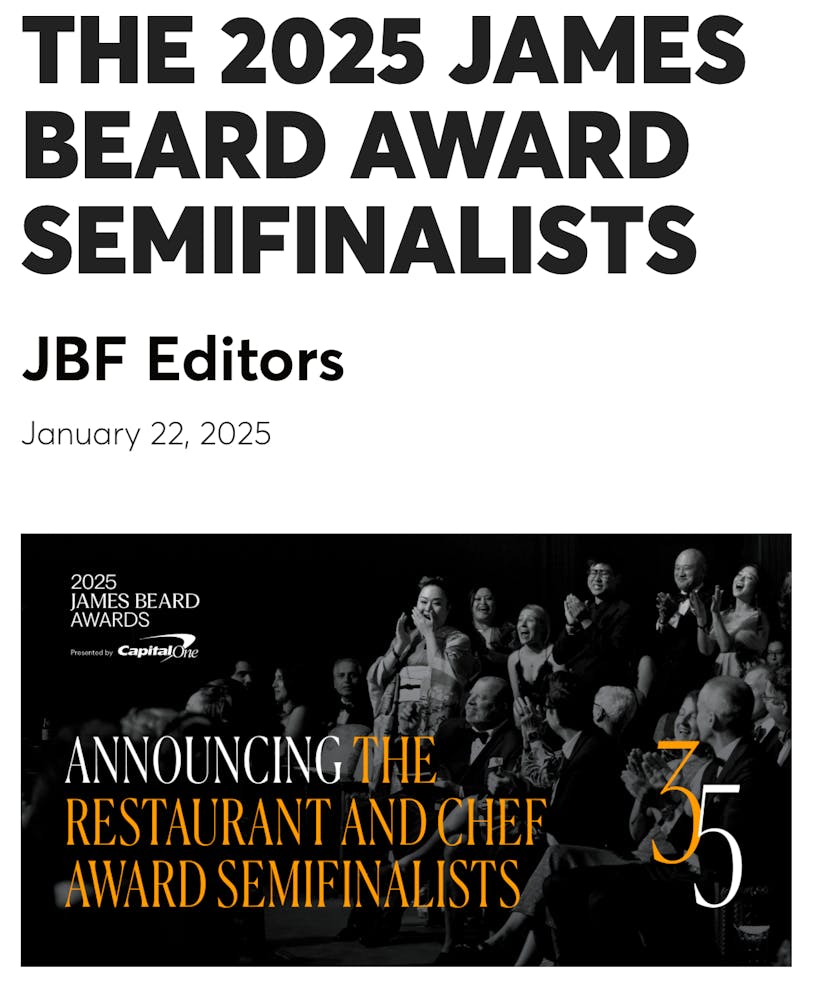 We are honored to be nominated by the James Beared Foundation as a Semi-Finalist for 2025 “Best New Restaurant”
